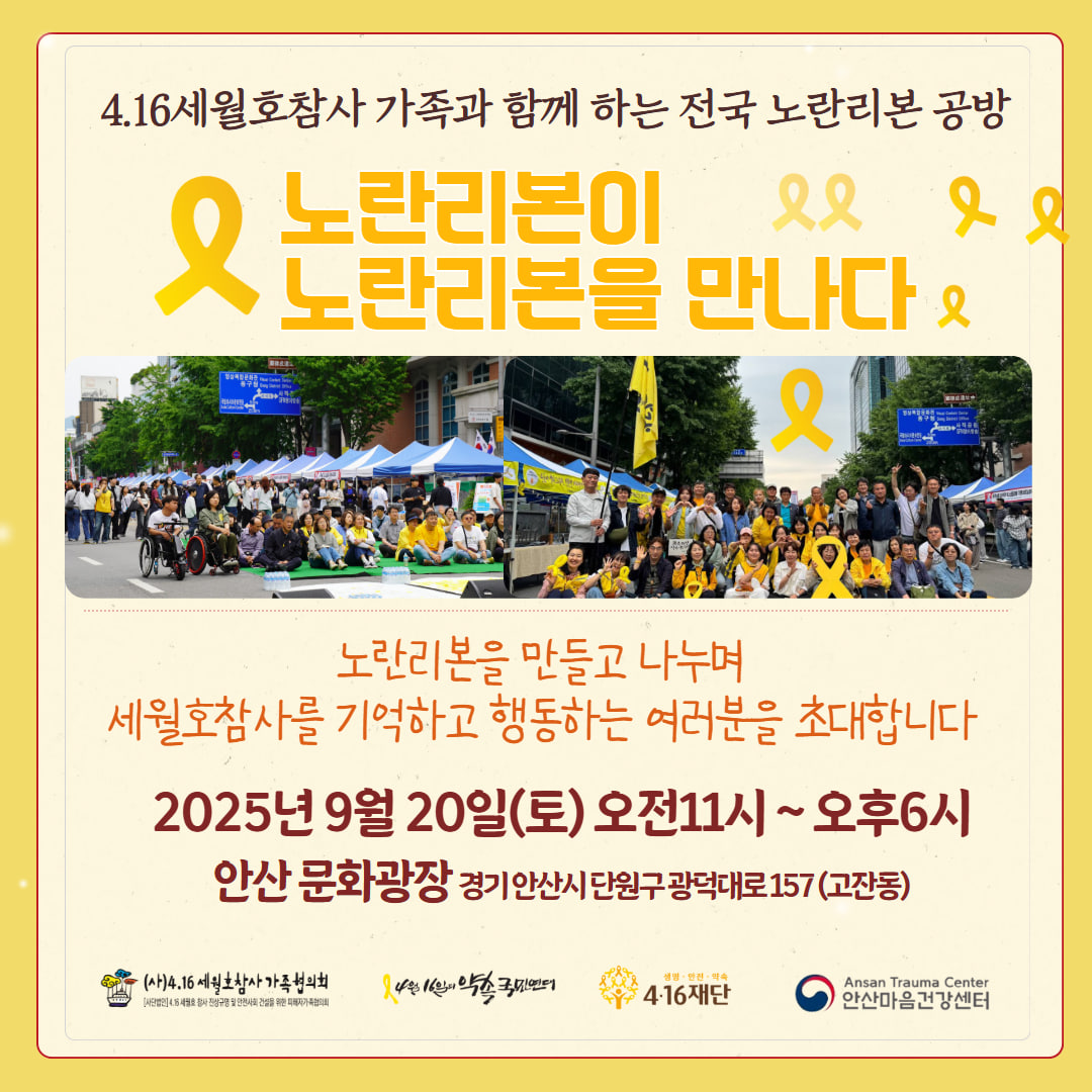 <노란리본이 노란리본을 만나다>는 11년 넘게 노란리본을 만들고 나누며 기억의 실천을 이어온 4.16기억시민들과 세월호참사 가족들과 함께 모여 서로의 마음을 나누고 의지를 다지는 자리입니다.