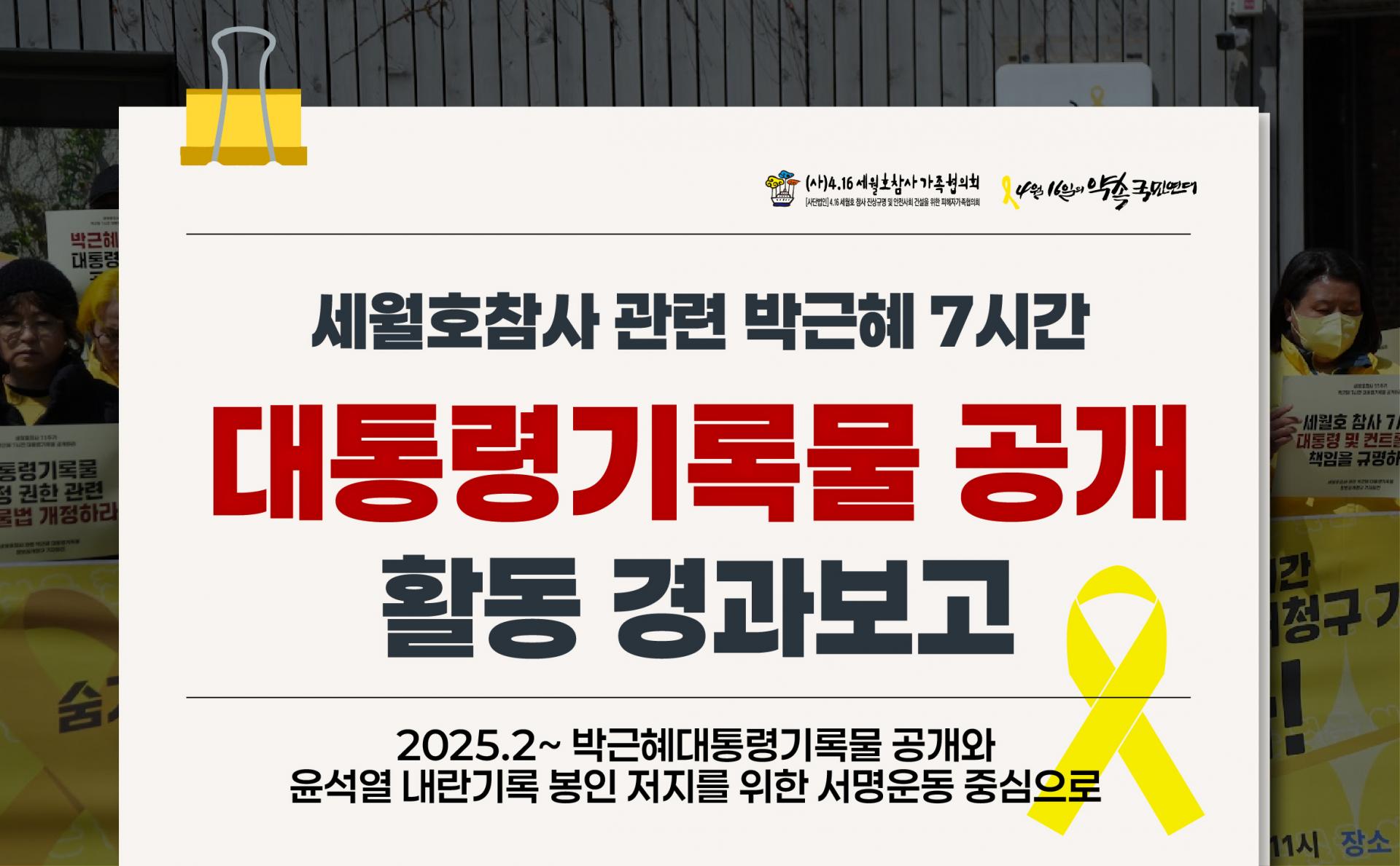 - 박근혜 대통령기록물 공개 및 윤석열 내란 기록 봉인 반대의 활동을 제도 개혁으로 연결하지 못한다면, 진실은 또다시 봉인될 수 있습니다. 따라서 피해자들과 시민사회는 국회, 학계, 기록학계와 함께 법·제도 개혁 운동을 이어가며, 세월호참사를 포함한 앞으로의 모든 재난참사 대응에서 “국민의 알 권리와 피해자의 진실 접근권”을 보장하는 최소한의 장치가 필요합니다.
