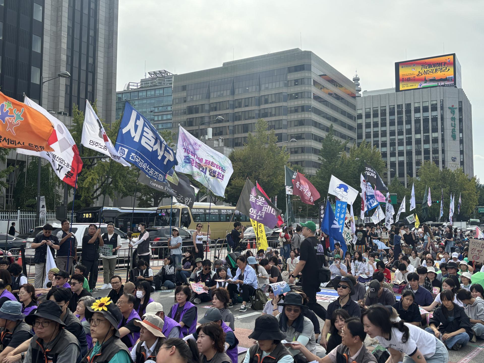 기후정의행진의 하이라이트라고 하면, 단연 다이인(Die-in) 퍼포먼스입니다. 세종대로 한복판에서 수천 명의 시민들이 동시에 땅에 드러누웠습니다. 그 모습은 기후위기로 인해 이미 죽어간 수많은 생명과 제대로 보호받지 못한 채 희생당한 재난 피해자들을 상징합니다. 세월호에서, 이태원에서, 그리고 기후재난의 현장에서 같은 교훈을 반복해서 확인해야 하는 현실이 무겁게 다가왔지만, 동시에 함께 싸워 나가겠다는 연대의 결의가 더욱 강하게 전해졌습니다.